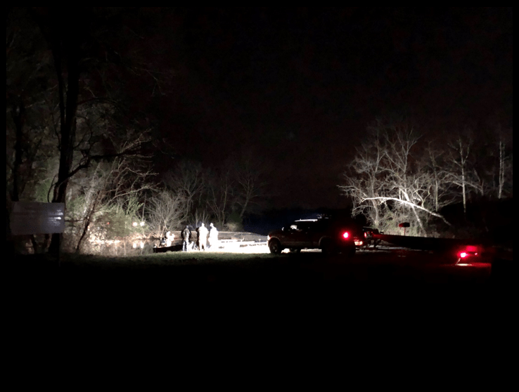 At 2:30am, a caravan of big pickup trucks pulled up, pulling various sizes of boats, with banks of bright lights on all, on the road between me and the river.