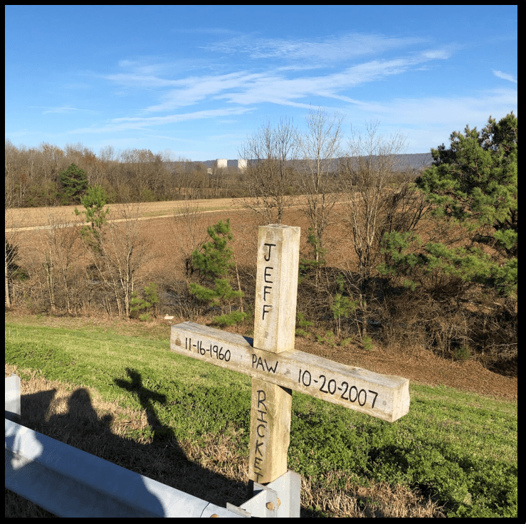 And upon taking the entrance ramp (I believe it was) to AL-72, I noticed over the treetops, in the distance, the tell-tell signs of what I immediately recognized as… the Nuclear Flumes of a power plant. Not expecting them at all I quickly stopped to snap a photo, which just so happened to be in front of this memorial to Jeff, R.I.P.