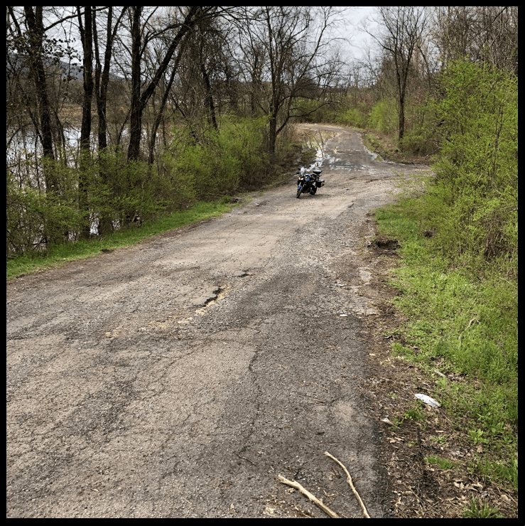 I quickly found my turn-off to my first planned camp site: but what you can’t really derive from the angle in this photo is, that from the top of the exit—you can’t see the turn off to the right beside my bike… all you see is that body of water to the left… and I soon could feel the overwhelming feelings of “oh’ shit” arising in my throat.